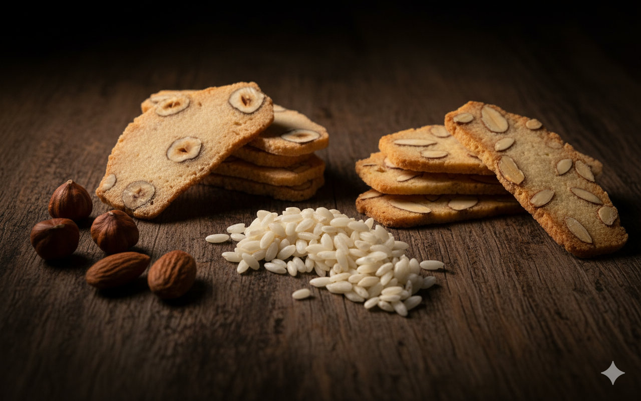 Cialde croccanti con farina di riso riso aromatico con nocciole e mandorle dell'azienda I Ferrari con Mandorle e Nocciole Bio.