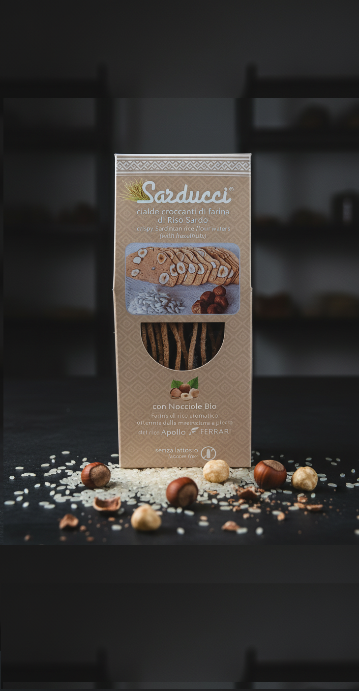 Cialde croccanti con farina di riso bianco aromatico e Nocciole Bio.