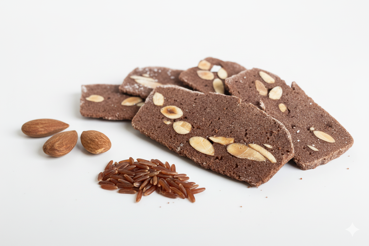 Cialde croccanti con farina di riso rosso Ermes dell'azienda I Ferrari con Mandorle Bio.